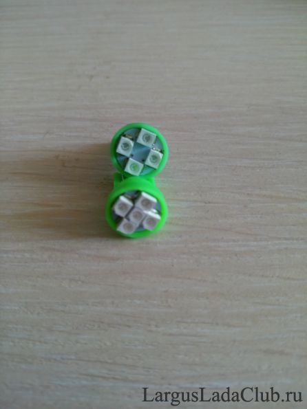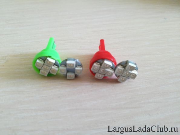 Для начала, месяц назад, были заказаны и получены от "товарищей" из поднебесной, 2 светодиодных лампочки зеленого и 2 красного свечения с пятью светодиодами на борту у каждой. Цоколь - T10 Стоимостью - 0,70$ за 4 штуки.