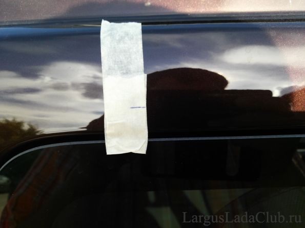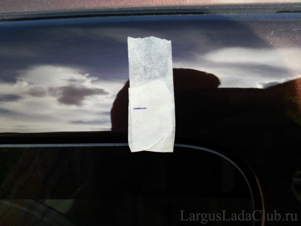 Выровнял по меткам, сделал поправку на дефлектор двери и приложил(приклеил не сильно, что бы если что, то можно было безболезненно оторвать, поправить и приклеить заново) открытыми уголками скотча к кузову.