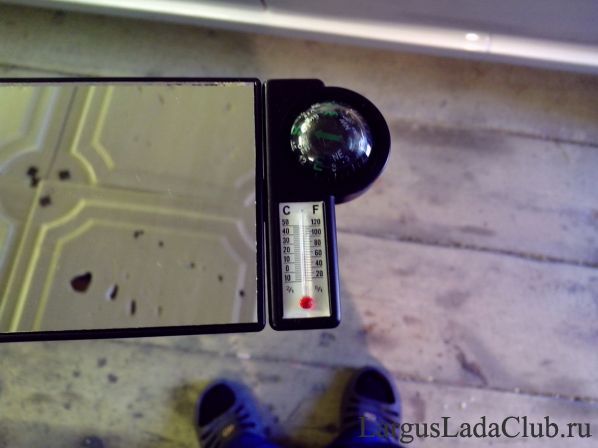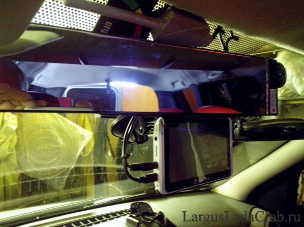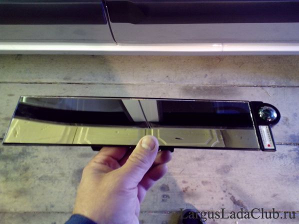 Так же поставил поверх штатного, выписанное из Ларгус шопа, большое панорамное зеркало, с компасом и термометром. Компас и термометр я снял, а с панорамным зеркалом, обзор стал гораздо лучше!