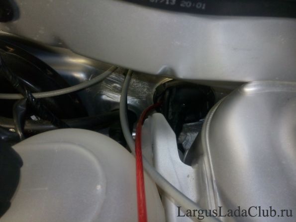 Затем занялся протяжкой кабелей на акустику и питание. Кабель питания усилителя, пустил от АКБ по левому борту. Для этого с помощью стального провода, протянул кабель через резиновую заглушку моторного отсека: