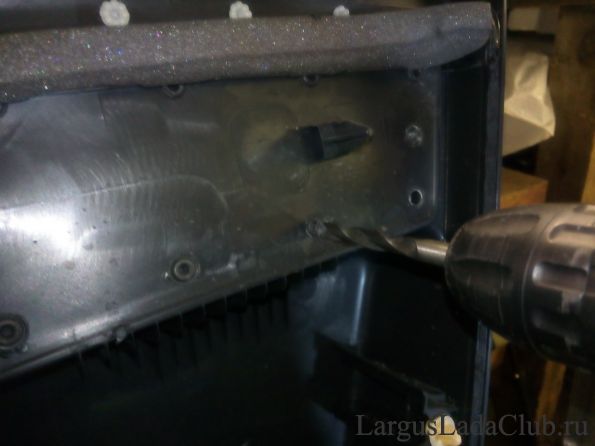 Чтобы снять верхнюю накладку подлокотника, нужно открутить с обратной стороны 4 самореза, к двум есть свободный доступ, а для доступа к остальным двум, пришлось просверлить технологические отверстия.