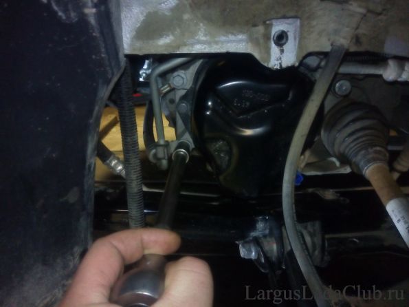 Затем головкой на 13 откручиваем верхний болт крепления тяги. После этого я на сколько возможно, помыл все от грязи, чтобы она в последующем не осыпалась случайно в открытую коробку передач и открутил гайку нижнего крепления тяги, головкой на 18: