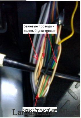 4. При поиске нашего бежевого провода нужно "прозвонить" два тонких одиночных провода указанные в инструкции и на фото, намотав длинный коричневый провод на иголку и включив заднюю передачу.