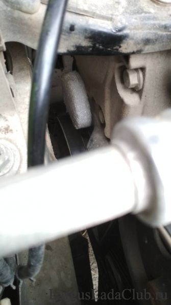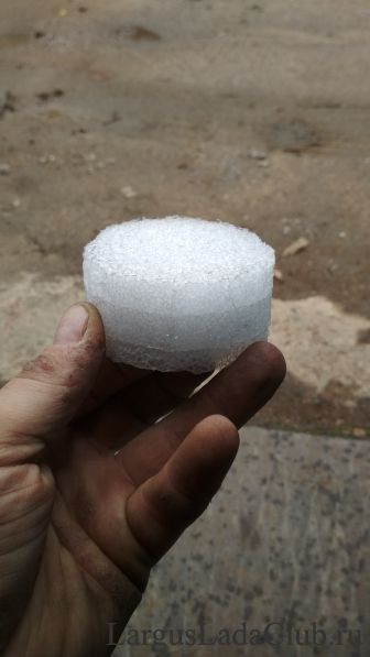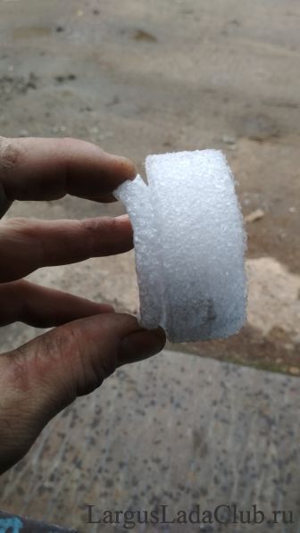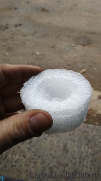 Ездить так нельзя, грязь в приводе ГРМ противопоказана. Ничего подходящего из пластмассы я найти не смог. И тут мне на глаза попался кусок уплотнителя из изолона. Зная размеры отверстия (66 мм) я вырезал ножом шайбу большего диаметра (70 мм) и конус под торчащую гайку крепления. Сделал недалеко от края неглубокий надрез и просто вставил ее на место.