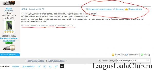 Товарищи админы, а куда делась возможность редактирования своих постов? ПС. Вот сейчас написал этот пост - вижу кнопка редактирования есть. А пост в теме про фейс-лифт ларгуса, написанный 2 часа назад, уже не могу редактировать. Раньше вроде через 2 дня кнопка редактирования исчезала Добавлено новое сообщение 16-03-2021 в 13:42:05: вот кстати. пост создан сегодня в 10.52 . Редактировался в 10.55. В 13.35 - кнопки "Редактировать" уже нет Редактировалось: 1 раз (Последний: 16 марта 2021 в 13:42) |