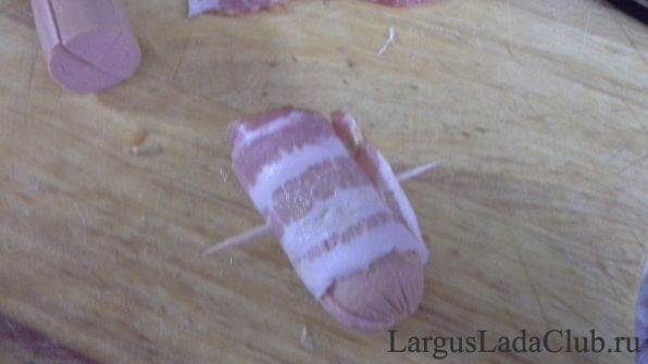 Шикарный перекус за 7 минут. Любимое блюдо сына и мое. Требуется бекон, нарезаный тонкими пластами, сосиски, горчица и зубочистки. Режем сосиски поперек напопалам, делаем крестообразные надрезы по торцам половинок сосисок. Стандатные полоски из нарезки бекона решем поперек напопалам. Намазываем бекон горчицей. ![]() ![]() Обматываем половинку сосиски половинкой ломтика бекона и фиксируем бекон зубочисткой. ![]() Выкладываем в разогретую на огне сковородку и обжариваем до золотистой корлчки. ![]() Приятного аппетита! ![]() | ||||||