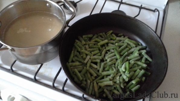в сковороду высыпал резанною замароженную стручковую фасоль