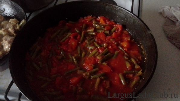 В уже обезвоженную смесь томатов и зеленой фасоли жобовляем остатки тлматного слка из консервной банки.