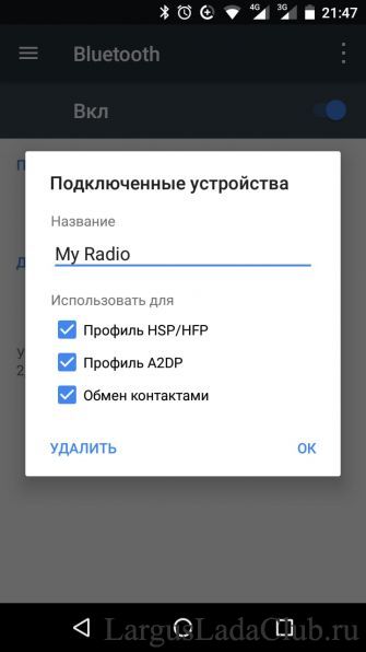 | OlegSGV: | | Если выключить на смарте блютуз то звук появляется. Но тогда на звонок через громкую связь уже не ответишь. Есть варианты чтоб и навигатор говорил и чиобы на звонок ответить через магнитолу? | В телефоне в настройках коннекта блютуса для ларгуса сними галку "мультимедиа аудиоустройство", оставь только "аудиоустройство телефона" и "обмен контактами". Либо оставь всё как есть, но в магнитоле выбери источник звука "bluetooth", тогда навигатор через колонки говорить будет. Редактировалось: 1 раз (Последний: 9 апреля 2022 в 01:14) |