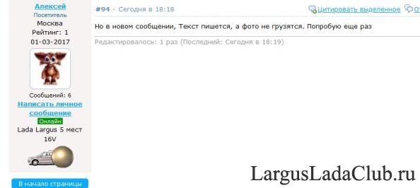 Писал отзыв в тему: Партеры НЛК- Москва - Автосервис CheckEngine Auto. Фото (размер по длинной стороне 800 пикселей) в сообщение вставлял по крайней кнопке, с компа (фото загружалось) В какой то момент сообщение пропало, не знаю почему, на кнопку "отправить" не нажимал, может на компе сбой произошел. Решил заново написать, текст пишется, фото не вставляется. Может повторно загруженные фото не вставляются? Где на сайте поискать загруженные мной фото? В профиле посмотрел, в альбоме посмотрел, где еще посмотреть надо? Lada Largus: 5 мест; К4М, 102 л.с.; XTAKS0Y5LH; Серый базальт; май 2017г. | ||||||