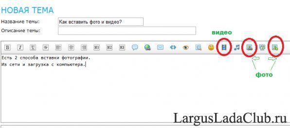 Есть 2 способа вставки фотографии. Из сети и загрузка с компьютера. Так же вы можете вставить видео с Ютуб, для этого вам надо скопировать именно код HTML и вставить его в тему. ![]() Допшоп клубный сервис Лада Ларгус в СПБ Передовиков д 8 А Тел 8921 773 33 04 | ||||