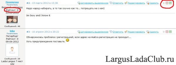 Санкт-Петербург Рейтинг: 6510 29-02-2012 Сообщений: 5144 Написать личное сообщение Lada Largus Фургон 8V | Карма пользователя - это сумма положительных и отрицательных оценок его профиля другими пользователями (зеленая и красная стрелочки под аватаром в комментах и форуме). Рейтинг пользователя - это количество его статей, фотографий и записей в блоге, умноженное на 5. Соответственно, чем больше материалов пользователь добавляет на сайт - тем выше его рейтинг. Выложенный материал (фото, блог, статья) - 5 баллов за плюс Комментарий к материалу - 2 балла за плюс Комментарий на форуме - 1 балл за плюс Вы можете проставлять + - в зависимости от того хотите ли вы поблагодарить пользователя за пост либо пост вызвал у вас негативные эмоции. Редактировалось: 3 раз (Последний: 23 мая 2012 в 14:24) |