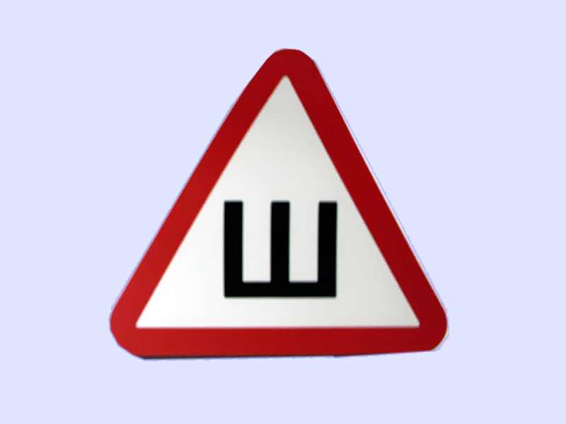 "Шипы" - в виде равностороннего треугольника белого цвета вершиной вверх с каймой красного цвета, в который вписана буква "Ш" черного цвета (сторона треугольника не менее 200 мм, ширина каймы - 1/10 стороны) - сзади механических транспортных средств, имеющих ошипованные шины.