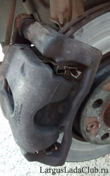 Скоба с поршнем тоже притянута крепко. Колодки (видно на фото) ещё толстые, процентов 70 минимум толщины ещё есть.