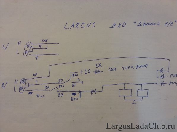 Вводная Итак, ПДД обязывают иметь ДХО или использовать ближний свет фар или противотуманки. ПТФ не работают без ближнего света, а ближний "жгет" еще кучу ламп. ПТФ можно перекоммутировать на работу без ближнего, но они стоят низко, будут постоянно грязные. Кроме того в них стоит не самая дешевая и легкозаменяемая лампа. Варианты с китайскими дополнительными светодиодами не рассматриваю по причине их скоропостижной непременной смерти и не тянущим на роль нормального ДХО. Фирменные ДХО типа Hella дороги. Плюс я не сторонник бессмысленного уродования экстерьера автомобиля без явной необходимости. Кроме того, ДХО имеют малую площадь и будут требовать периодичной очистки. Кароче, самые простые пути не наши! В любой машине есть дальний свет, установленный за большой площадью остекления головных фар. В США дальний свет фар в полнакала используется как штатные ДХО. И не забываем, что дальний сфокусирован в верх, а не на дорогу как ПТФ или ближний, а значит максимальная яркость при минимальной мощности! Будем так и тут действовать. Как добиться свечения в полнакала ламп? Это достигается тремя способами: 1. Обе фары включаются последовательно. 2. Обе фары включаться через мощный резистор. 3. обе фары включаются через специальное устройство - регулятор яркости с ШИМ. Вариант 1 самый простой, но порой тяжело исполним на конкретных авто. Второй мало реален. Третий отличный вариант, с регулировкой мощности (яркости) и наличии всей логики ДХО. Только требует расходов для покупки нечто такого РХО-24 Реализация Проанализировав логику работы освещения Ларгус, я пришел к выводу: в авто уже заложена схема по варианту №1. При выключенном освещении лампы ближнего и дальнего света собираются в последовательную цепь! Для чего это, я не понял, дальнейших элементов для создания штатных ДХО я в авто не обнаружил. Поэтому родилась схема: ![]() (простите за чертеж от руки в гараже, лень...) Разрезаем черный и белый провод левой фары и коммутируем как в схеме. Тут используется два реле, одно подает на нити ламп + (помним, что они уже включены последовательно!), другое отключает ближние. Можно оставить одно реле, будет работать дальний и ближний в пол-накала, белый провод тогда не режем. Питание через предохранитель 5А снимаем с синего провода реле топливного насоса. Массу для реле берем с разрезанного черного провода. ![]() Управление реле через диоды типа 1N4007, белой полоской к реле, (можно вообще любые слаботочные) подключаем к оранжевому проводу дальнего левой фары и проводу ее же габарита (непомню цвет, но он там один, не ошибетесь). Диод, с ближнего (белый провод) на реле, отключающий ДХО при включении ближнего, не обязателен, т.к. ДХО отключиться габаритом, я это сделал "на автомате" ) Все, вся коммутация в блоке предохранителей моторного отсека, никаких проводов длинее 30 см не надо. ![]() ![]() Третий диод я использовал для подачи + с реле, включающимся от ручника. Это если уж совсем по правильному, чтоб при остановке гасить ДХО, т.к. авто оборудовалась автозапуском. Ток 2х нитей дальнего получился, если не ошибаюсь, 3.4А. Индикатор дальнего работает на пол-яркости при работе ДХО. Реле обычные автомобильные, пятиконтактные. Провода до ламп надо не менее 1.5мм2, до диодов и обмоток реле без разницы. Все соединения пропаяйте или обожмите или тщательно скрутите и хорошо заизолируйте. Ну и кон