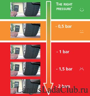 Нашёл сведения про правильно накачанные колеса в зависимости от индекса нагрузки. Для индекса 88. На Ларгусе качать надо 2, 8 перед и 3.0 зад. Коррекция делается по правилу: 92 - 88=4. 4 умножаем на 0, 1 атм. =0, 4 атм. Т.е. чтобы шина правильно работала по пятну контакта , без чрезмерной деформации каркаса с сохранением свойств эластичности, безопасной управляемости машины на дороге, показатели давления накачки для резины с индексом нагрузки 88 должны быть увеличены против 2, 4 и 2, 6 для индекса 92. |