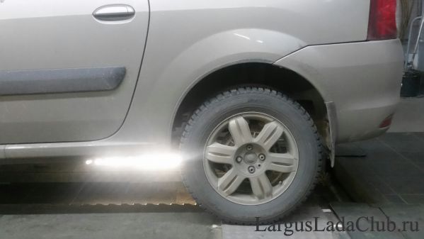 Для установки вставок с демонтажом пружины, поочерёдно вывешивалось только одно колесо. Амортизаторы были предварительно сняты. В семиместном Ларгусе для доступа к чашке верхней опоры амортизатора необходимо демонтировать подлокотники третьего ряда сидений, частично снять обшивку и демонтировать кожухи под подлокотники.